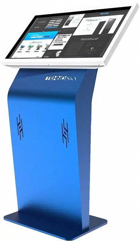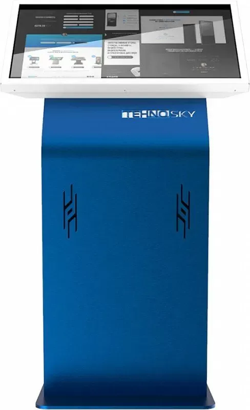 Информационная панель или сенсорный киоск Tehno-Sky DS-T серии предназначен для использования как информационно-справочный киоск, в составе информационных систем и систем управления очередью (СУО), а также как киоск самообслуживания. Имеет безвинтовую, антивандальную конструкцию. Корпус изготовлен из конструкционной стали 2 мм.  Корпус закреплен на устойчивом основании, что уменьшает парусность и шаткость устройства. Для защиты экрана используется закалённое стекло 4 мм с нанесённым олеофобным покрытием. Оснащается системой защиты от несанкционированного включения/выключения.