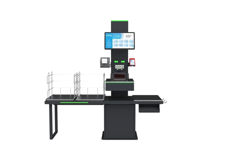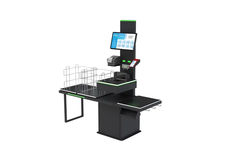 После оплаты чековый принтер отдаёт чек, и покупатель может забрать свои покупки из зоны №3